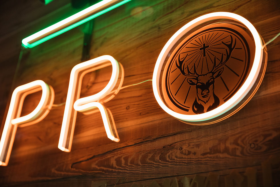 Custom signage crafted for Jägermeister Biergaten, Grön Lund Stockholm. Featuring a LED-Neon Sign with brass details.